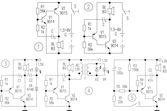 | 选择分类:当前分类——小说笑话 相关联或者相类似的文章: 感光线路板的制作技巧(103) ATX电源辅助电路原理与检修(101) 简易8路数显抢答器制作过程(99) [精]5分钟编写一个ASP论坛(99) Cookies常用命令简介(99) 一名漂泊在外的蚁族写给父亲的忏悔信(99) 三菱梯型图 PLC指令详解 (99) 80后从盗卖脏物到人间蒸发赖帐逃欠款(99) 三菱FX系列PLC编程口通信协议总览(99) 方便、实用、小巧的摄像头照相、录像软件(99) 三菱 PLC梯型图(指令编码)反汇编程序-----开源 PLC 编程重点参考资料 (99) 某君上馆子去吃鲱鱼(99) 如何节约程序开发中的时间(99) 四芯耳机插头(95) AT89C系列单片机加密方式(94) 用互补管制作电灯轻触开关(93) 加入本站送创业资金!绝对真实(93) 认为本站产品价格贵的朋友必看(91) 电子工程师面试常被问到的问题(89) 简单实用的遥控开关(85) 首页 前页 后页 尾页 本站推荐: | 讯响器和LED点亮实验 2003年,第9期,类别:电子技校 1. 电路简介。 图1是讯响器(又称音频振荡器、信号发生器)的典型电路。按图在面包板上连好电路,当电容器C从3.3nF~100μF取不同的值时,扬声器可发出不同的音调响声,将C定在47nF左右,改变R1的值,扬声器的发声音调也可发生变化。注意R1不可太小,一般应大于1kΩ,否则易使V1损坏。如果万用表的两表笔并接在R1的两端,量程选择旋钮放在交直流电压的不同挡位转动,也可使扬声器的发声音调发生变化。将图1的V1和V2换一下位置变成图2电路,也有相同效果。 1、 本站不保证以上观点正确,就算是本站原创作品,本站也不保证内容正确。 2、如果您拥有本文版权,并且不想在本站转载,请书面通知本站立即删除并且向您公开道歉! |