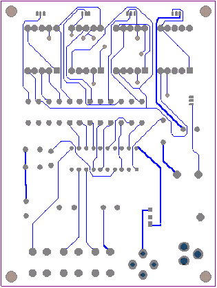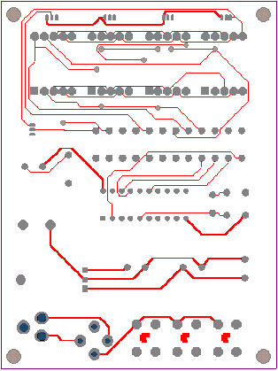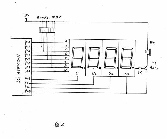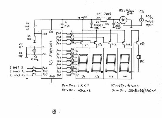| 选择分类:当前分类——当前分类 相关联或者相类似的文章: 三十分钟一个小时学会单片机(9045) 什么是单片机?单片机有什么用? (8723) 如何用STC板将代码烧录进IC(8681) 怎样安装AT51编程板的USB转串口软件?(8206) 送给单片机爱好者——LED在线编码器(1814) 送给单片机爱好者——LED点阵在线编码器(1544) 单片机系统中的汉字显示(1492) 带语音报数功能的抢答器(1489) 用VB进行串口实时数据采集(1347) 用AT89C2051设计超声波测距仪(1171) 小小电子闹钟 生活学习良伴(1165) DS1820测温原理(1129) 几句代码实现控制摄像头(转)(1117) STC单片机选型指南(1111) 自制PIC单片机编程器(1105) USB转串口芯片CH340(1010) 快速学习单片机之黄金机会!(1010) 告戒购单片机开发实验板初学者(970) 新款实用旋转LED显示屏A(890) 使用市售 USB转RS232串口与PLC通信的测试报告 (881) 首页 前页 后页 尾页 本站推荐: | 小小电子闹钟 生活学习良伴 小小电子闹钟 生活学习良伴 ——— 一款电路极简的单片机电子钟设计详解 电路特点 这里介绍的电子钟,电路可称得上极简,它仅使用单片的20引脚单片机完成电子钟的全部功能,而笔者见到的其它设计方案均采用二片以上的多片IC实现。 电路见图1。 ![]() 一片20引脚的单片机AT89C2051为电子钟主体,其显示数据从P1口分时输出,P3.0~3.3则输出对应的位选通信号。由于LED数码管点亮时耗电较大,故使用了四只PNP型晶体管VT1~VT4进行放大。本来笔者还有一种更简的设计方案(见图2),可省去VT1~VT4及R1~R4八个元件,但这种设计由于单片机输出口的灌入电流有限(约20mA),数码管亮度较暗而不向读者介绍,除非你采用了高亮度的发光数码管。 ![]() P3.4、P3.5、3.7外接了三个轻触式按键,这里我们分别命名为:模式设定键set(P3.4)、时调整键hour(P3.5)、分调整键min(P3.7)。C1、R13组成上电复位电路。VT5及蜂鸣器Bz为闹时讯响电路。三端稳压器7805输出的5V电压供整个系统工作。此电子钟可与任何9~20V/100mA的交直流电源适配器配合工作,适应性强。 电子钟功能 1.走时:通过模式设定键set选择为走时,U1、U2显示小时,U3、U4显示分。U2的小数点为秒点,每秒闪烁一次。 2.走时调整:通过模式设定键set选择为走时调整,按下hour键对U1、U2的走时“时”显示进行调整(每0.2秒递加1)。按下min键对U3、U4的走时“分”显示进行调整(每0.2秒递加1)。 3.闹时调整:通过模式设定键set选择为闹时调整,按下hour键对U1、U2的闹时“时”显示进行调整(每0.2秒递加1)。按下min键对U3、U4的闹时“分”显示进行调整(每0.2秒递加1)。 4.闹时启/停设定:通过模式设定键set选择为闹时启/停设定,按下min键U3的小数点点亮,闹时功能启动;按下hour键U3的小数点熄灭,闹时功能关停。 由于电路设计得极其简单,因此丰富的功能只能由软件完成,这里软件设计成为了关键。下面介绍软件设计要点。 图3为主程序状态流程。 ![]() 图3 运行时建立的主要状态标志如下: flag—掉电标志。掉电后,flag内为一随机数;重新设定时间后flag内写入标志数55H。 set—工作模式设定标志。 hour—走时“时”单元。 min—走时“分”单元。 sec—走时“秒”单元。 deda—走时5mS计数单元 t_hour—闹时“时”单元。 t_min—闹时“分”单元。 d_05s—0.5秒位标志。每秒钟的前0.5秒置1,后0.5秒置0,以使秒点闪烁。 o_f—闹时启/停位标志。闹时启动置1,闹时关停置0。 另外将定时器T0设定为5mS的定时中断。这里晶振频率为12MHz,因此5mS的初值为-5000,但实际上程序还要作其它运算,使得时间偏长,经调整为-4800后试验刚好。计时单元deda每次中断均加1。走时函数判断deda>=200时即令秒单元sec加1。同理秒单元sec满60后令分单元min加1。分单元min满60后令时单元hour加1。时单元hour满24后清0。 上电后,首先进行初始化,对各状态标志、输入输出口及定时器T0进行初始化工作,以适应后面程序的要求。 随后程序判断有无set键按下,如按下,则set键值从0起加1。set键值只能从0加到3,然后又回到0。 接下来,根据键值进行散转。若set=0,运行走时程序;若set=1,进入调整闹时时间程序;若set=2,进入调整走时时间程序;若set=3,显示已调好的闹时时间,同时进入启/停闹时程序。 散转完后,进行判断掉电标志flag是否等于55H。若不等,说明刚开机上电或运行过程中掉过电,这时四个数码管以1Hz的频率闪烁四个8字,提示时间不准;若相等,说明未掉电,RAM区内容未变化,时间准确。 再下来程序又转回到初始化之后进行循环运行。 由于使用了四只数码管密集排列,因此只能采用双面印刷板设计,图4、5分别为正面(元件面)、反面的印板图。尺寸3000milx4000mil(7.62cmx10.16cm)。图6为计算机输出的三维仿真印制板。 ![]() 图4 ![]() 图5 ![]() 图6 元件选用 为了走时准确,晶振X最好选用温漂小的。四个数码管U1~U4可选用发绿光的,这样光泽较柔和。蜂鸣器Bz要购买绕线型的电动式蜂鸣器(市场上有一种加电压即工作的蜂鸣器这里不适用),因驱动信号为脉冲信号。其它元件一般无特殊要求。 使用方法 上电后,四个LED数码管闪烁四个8字。 按一下set键,闪烁现象消失(此时set=1),U1的小数点亮,说明此刻可以调整闹时时间。按下hour键,U1、U2作加法;按下min键,U3、U4作加法。这些调整好的数据被同时送入RAM区的闹时记忆“时”单元t_hour和闹时记忆“分”单元t_min。 再按一下set键,set=2,U2的小数点亮,此刻可以调整走时时间。按下hour键,U1、U2作加法;按下min键,U3、U4作