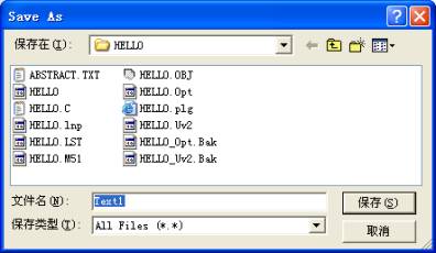 6.输入完毕后点击菜单的File选项,在弹出的下拉菜单中选择“保存”命令存盘源程序文件,这时会弹出如图2.9所示的存盘源程序画面,在文件名栏内输入源程序的文件名,在此示范中把Text1保存成hello.c。主要Keil C51支持汇编和C语言,且uVision3要根据后缀判断文件的类型,从而自动进行处理,因此存盘时应注意输入的文件名应带扩展名.ASM或.C。源程序文件hello.c是一个c语言程序,如果用户想建立的是一个汇编程序,则输入文件名称hello.asm。保存完毕后请注意观察,保存前后源程序有哪些不同,关键字变成蓝颜色了吗?这也是用户检查程序命令行的好方法,您体会到了吗?