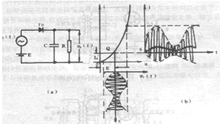 2、大信叼峰值包络检波 如图6(a)是大信号检波电路,由于输出电压交流部分与调制信号最大值成正比,故又称为直线性检波,其特点是:(1)输入电压幅度一般500毫伏以上;(2)没有偏置电压E,由于输出电压的反作用,实际上工作点处于u<0的区段[见图6(b)]。因此,大信号检波二极管,在载波一周期内,只有一段时间寻通,而另一段时间截止。大信号峰值二极管检波器的主要参数计算如下: K=cosθ