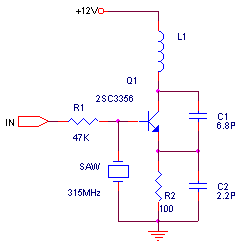 接收机可使用超再生电路或超外差电路,超再生电路成本低,功耗小可达100uA左右,调整良好的超再生电路灵敏度和一级高放、一级振荡、一级混频以及两级中放的超外差接收机差不多。然而,超再生电路的工作稳定性比较差,选择性差,从而降低了抗干扰能力。下图为典型的超再生接收电路。