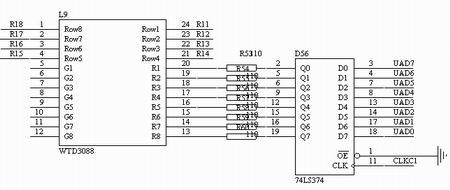 点阵显示模块WTD3088的(红色)列输入线接至内部LED的阴极端,行输入线接至内部LED的阳极端(若阳极端输入为高电平,阴极端输入低电平,则该LED点亮)。发光点的分布如图22-0所示。  Fig 22-0 WTD3088 LED分布 如图22-1示,本实验模块使用74LS374来控制列输入线的电平值。将74LS374的某输出置0,则对应的LED阴极端被置低。如图22-2示,本实验模块使用74LS273来控制行输入线,并通过9013提供电流驱动。将74LS273的某输出置1,则对应的LED阳极端被置高。每次系统重新开启或总清后,74LS273输出为全0,LED显示被关闭。