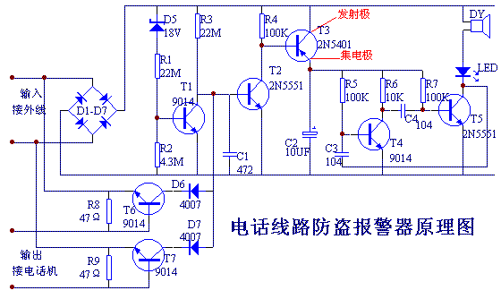 此报警器能够监测并防止他人非法盗用你的电话线路。当有人在你的电话外线上并机盗打时该报警器就发出干扰信号,使盗用者不能拨号,并用声光向主人提示有人盗打电话。下图是该防盗器的原理图,平时邮局程控机在外线上送出约50V 的待机电压,经 D1-D4极性转换上边为正极,D5击穿经 R2 使 T1 基极电位升高,T1 导通 、T2 截止、T3 截止,由T4、T5 组成的振荡电路不工作。当盗用电话提机时,外线电压下降为9V左右,不能使 D5 击穿,T1 因无偏压而截止,T2基极电位升高导通。T2的导通使 T3 导通并带动后级音频振荡电路工作,LED、DY发出声光报警,并通过LED、DY将干扰信号加在外线上,同时将外线电压拉低,使盗用电话者无法拨号而强迫挂机。主人提机虽然也使电压降低,并使T1截止但因T6或T7(用T6、T7两只管子是为了安装方便,进线可以不分极性接入,D6、D7起隔离作用)通过电话机获得基极电流而导通,使 T3 不能导通振荡电路不工作。因此主人可正常拨号通话不受影响。因主人电话与外线之间只接有阻值很小的R8、R9 所以接电话时振零通话均不受影响。