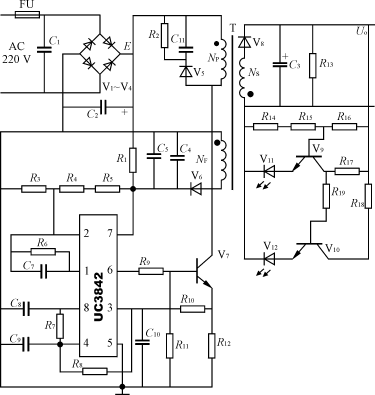 图1中C1、V1~V4、C2组成滤波整流电路,变压器T为高频变压器,V5、R2、C11组成功率开关管V7的保护电路,NF为供给IC电源的绕组。单端输出IC为UC3842,其8脚输出5V基准电压,2脚为反相输入,1脚为放大器输出,4脚为振荡电容C9、电阻R7输入端,5脚为接地端,3脚为过流保护端,6脚为调宽单脉冲输出端,7脚为电源输入端。R6、C7组成负反馈,IC启动瞬间由R1供给启动电压,电路启动后由NF产生电势经V6、C4、C5整流滤波后供给IC工作电压。R12为过流保护取样电阻,V8、C3组成反激整流滤波输出电路。R13为内负载,V9~V12及R14~R19组成发光管显示电路。图1中V5、V6选用FR107,V8选用FR154,V7选用K792。