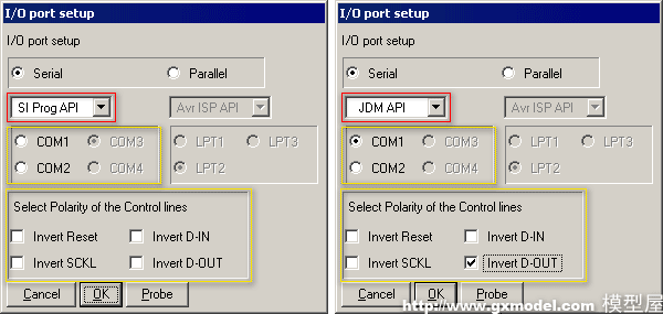 此时打开的对话框上,红色框内是选择编程器的类型,这里我们选择“JDM API”;中间黄框是选择所用的端口,可选择COM1-COM4,使用的是COM1;下边黄色框中是设置接口的一些其它设置,我试了一下选择右下方的选项后程序和接口可以正常使用,大家可以自己多试一下,当然最好是使用PIC16F84这样的可擦写的单片机,以免浪费。设置好后可以点击“OK”完成设置。