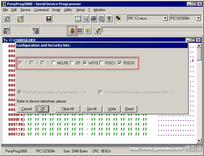 对于很多单片机来说除了写入程序之外还要写控制位(或叫控制字)用来设置单片机的工作模式,比如PIC12C509可以通过控制字来选择使用内部RC振荡还是外部晶振或者是外部RC振荡等时钟方式。点击那个带小锁的图标就可以打开下面对话框,其中MCLRE是控制复位方式,CP是设置保护,WDTE是设置看门狗是否启用,FOSC1和FOSC0用于设置时钟方式,设置好后点击“Write”按钮就可以写入控制字。