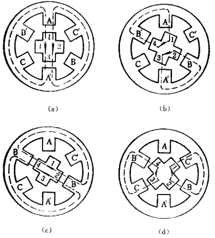 三、双三拍通电方式的基本原理 θ=360°/Zr×m 式中Zr是转子齿数;m是运行拍数。 一般步进电动机最常见的步距角是3°或1.5°。由上式可知,转子上不只4个齿(齿距角90°),而有40个齿(齿距角为9°)。为了使转子齿与定子齿对齐,两者的齿宽和齿距必须相等。因此,定子上除了6个极以外,在每个极面上还有5个和转子齿一样的小齿。步进电动机的结构图如图4所示。