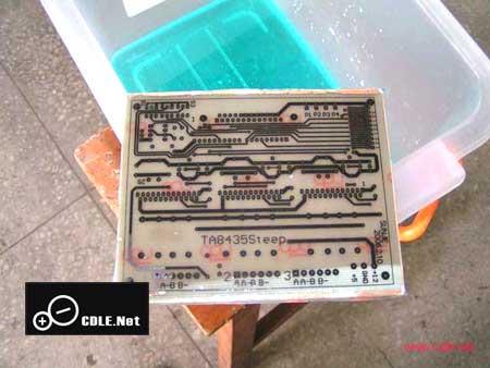 然后进行腐蚀,用买的塑料食品盒(15元)作容器,采用盐酸+双氧水+水(1:1:8)做腐蚀液,腐蚀速度快质量好,腐蚀过程大约3分钟(千万不要腐蚀过头)。