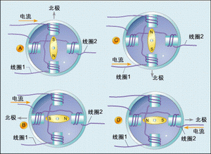 再假设我们切断绕组1中的电流,而按图2b所示方向给绕组2输送电流,那么定子的磁场就会指向左侧,而转子也会随之旋转,与定子磁场方向保持一致