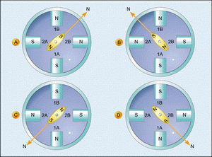 现在假设我们构造一个定子上缠绕有两个绕组的电机,内置一个能够绕中心任意转动的永久磁铁,这个可旋转部分叫做转子。图2给出了一种简单的电机,叫做双相双极电机,因为其定子上有两个绕组,而且其转子有两个磁极。如果我们按图2a所示方向给绕组1输送电流,而绕组2中没有电流流过,那么电机转子的南极就会自然地按图中所示,指向定子磁场的北极。