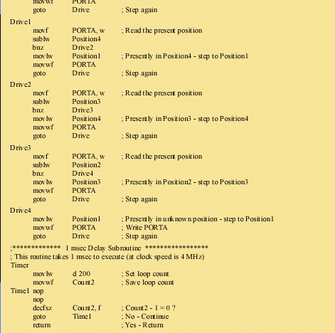 我本人在一块Microchip PIC16F877上,利用1N4003二极管和2SD1276A达灵顿晶体管实现了以上谈到的电机控制器。PIC的PortA第0位到第3位用来做数字输出。电机采用在Jameco购买的5V双相单极电机(Airpax [Thomson]生产,型号为M82101-P1),并且用同一个5V电源为PIC和电机供电。但在真正应用时,为避免给微控制器的电源信号引入噪声,建议大家还是分别用不同的电源为电机和微控制器供电。
