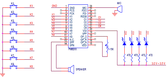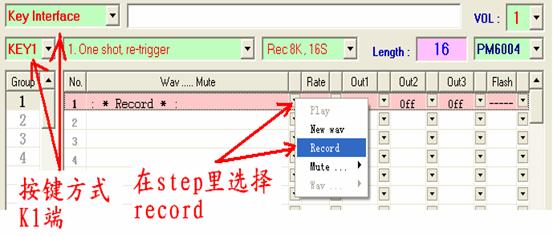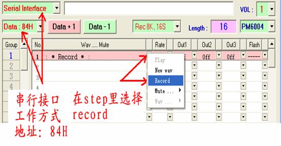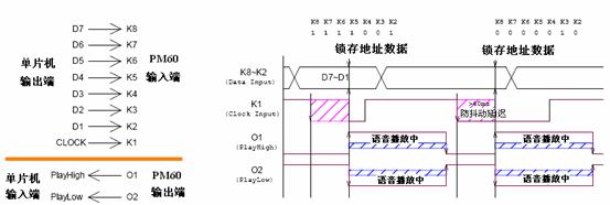 (2)并行地址接口: 在并行地址接口工作方式下,K1为同步时钟端,K2~K8为7位并行地址输入端,最大可分为27=128段。O1、O2位两种极性相反的忙信号输出,可由用户选择使用其中一条输出。作为忙信号,O1在播放语音时为高,放音完毕拉低;O2与其正好相反。 并行地址接口工作方式的电路如图5,工作时序如图6。 ![]() 图5 并行地址接口工作方式电路 ![]() 图6 并行地址接口工作方式时序图 (三)RESET时序 用单片机口线控制PM60的复位时,需要注意给完RESET管脚低信号后需要延迟300ms的时间,才能开始PM60的放音操作。放音操作,否则不能正常复位。 ![]() 图七 PM60的RESET时序 7. PM60的编程软件 PM60的编程软件的使用环境继承了PM50编程软件的风格,与PM50编程软件中“智能2代”工作方式类似,详细的使用方法请参阅PM50编程软件中“智能2代”部分的内容。其中略有改动的是,加入了“record”的设置以配合PM60可以接MIC录音的新功能。 8. PM60的MIC录音方式 PM60相对于PM50,除了在录音时间上有所增加,而且增加了MIC录音的功能。使PM60芯片的使用更具有灵活性。需要PM60的MIC录音功能时,在下图中所示的下拉菜单中选择对应选项。 ![]() PM60的录音需要在编程软件上预先设置好录音存储的位置,如果采用按键操作模式,则选择存储在K1~K8端;如果采用微控制器操作模式,则选择存储在对应的地址。两种设置方式如下图所示: