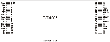 ISD4003系列TSOP及PDIP、SOIC引脚图 同相模拟输入(ANA IN+) 这是录音信号的同相输入端。输入放大器可用单端或差分驱动。单端驱动时,信号由耦合电容输入,最大幅度为峰峰值32mV,耦合电容和本端的3KΩ电阻输入阻抗决定了芯片频带的低端截止频率。差分驱动时,信号最大幅度为峰峰值16mV。这两种驱动方式见图2-14 (为ISD3300系列相同)。 串行输出(MISO) ISD的串行输出端。ISD未选中时,本端呈高阻态。 串行时钟(SCLK) ISD的时钟输入端,由主控制器产生,用于同步MOSI和MISO的数据传输。数据在SCLK上升沿锁存到ISD,在下降沿移出ISD。 中断(/INT) 本端为漏极开路输出。ISD在任何操作(包括快进)中检测到EOM或OVF时,本端变低并保持。中断状态在下一个SPI周期开始时清除。中断状态也可用RINT指令读取。 OVF标志----指示ISD的录、放操作已到达存储器的未尾。 EOM标志----只在放音中检测到内部的EOM标志时,此状态位才置1。 行地址时钟(RAC) 漏极开路输出。每个RAC周期表示ISD存储器的操作进行了一行(ISD4003系列中的存贮器其1200行)。该信号175ms保持高电平,低电平为25ms。快进模式下,RAC的218.75μs是高电平,31.25μs为低电平。该端可用于存储管理技术。