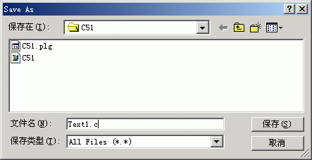 此时光标在编辑窗口里闪烁,这时可以键入用户的应用程序了,但笔者建议首先保存该空白的文件,单击菜单上的“File”,在下拉菜单中选中“Save As”选项单击,屏幕如下图所示,在“文件名”栏右侧的编辑框中,键入欲使用的文件名,同时,必须键入正确的扩展名。注意,如果用C语言编写程序,则扩展名为(.c);如果用汇编语言编写程序,则扩展名必须为(.asm)。然后,单击“保存”按钮。