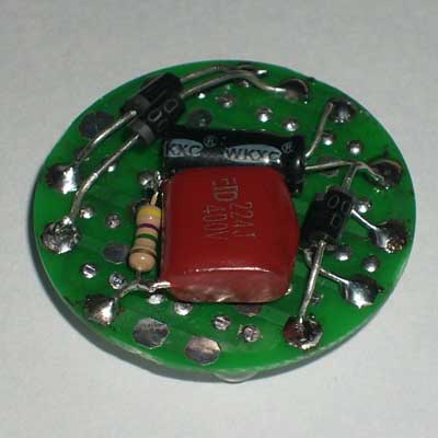 套件说明,罗口的电镀玻璃反光灯杯1只、圆型透明的平面封口玻璃1块、0.8mm高精度双面电路板1块、高亮白光草帽灯19只、400V224高压金属膜限流电容1只、1N4007整流二极管4只、4.7M高压泄流电阻1只、63V10UF消闪烁用滤波电容1只。 制作装配时需要电烙铁、万用表、尖嘴钳、剪钳、热熔胶枪(胶)等工具消耗品请自备。市面上相同功能和特性的LED灯售价高达18元以上,更有高达百元以上的LED灯,现在大家自己动手,只需要十多元就可以立即享用这世界上最新的环保省电LED照明技术!学校组织批量购买,每50套赠送一套备品,免费提供部分元件备品! 电路原理图:工作原理非常简单,通过电容限流了发光二极管的工作电流小于25MA,加上C2吸收了开关灯的冲击电流,有效的确保了发光二极管的使用寿命。采用电容降压,不消耗电能,不发热,效果好。(发光二极管的工作电流由C1的容量决定,如图最大不能超过474,如果发光二极管的工作电流超过了50MA,估计发光二极管的寿命会大大缩短!如果觉采用224亮度已经太亮,可以换容量为104的电容,这样LED的工作寿命会超过几万小时。)