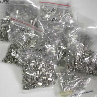 制作51编程器、学习板、实验板等常用。卧式晶振,高度3mm,本站出售的大多数晶振都用这种外型(太大和太小用起来不方便,用起来比圆柱型方便,体积又较小)。每只0.3元.