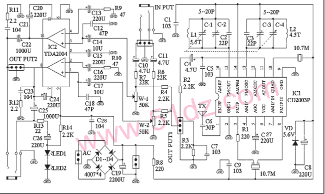 电子制作是综合能力的体现,从中可学到不少技术和经验,欢迎选购制作。一板两用,既可当FM收音机用,又可以当立体声功放用。给用户留了更多的设计空间,带有整流滤波,输入输出插座。可以接交流电也可以接直流电。