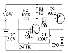 R1为Q1的集电极电阻,R2为Q1的基极的偏置电阻,使三极管Q1、Q2工作在放大状态。C1、R4组成反馈回路。当接通电源后,微小的电源波动或噪声经Q1、Q2放大,从Q2的集电极输出,再经C1、R4反馈回 Q1的基极,再经Q1、Q2进一步放大,再从Q2的集电极输出,经C1、R4再一次反馈回Q1的基极。。。就这样一次一次的放大,当放大到一定程度后,小灯炮点亮,当再放大到一定程度后,三极管完全导通不能再放大;由于不能再放大,微小的电源波动或噪声只能使输出端信号强度减少,经Q1、Q2后,从Q2的集电极输出更小的信号,再经C1、R4反馈回 Q1的基极,再从Q2的集电极输出进一步减小的信号,经C1、R4再一次反馈回Q1的基极。。。就这样一次一次的减小,当到一定程度后,小灯炮熄灭,当再小到一定程度后,三极管完全截止不能再减小;微小的电源波动或噪声又使输出端信号强。。。。就这样一直循环。小灯泡就亮、灭一直循环...改变C1和R4的值可以改变小灯泡闪烁的频率。