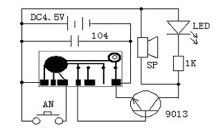 通电后AN没有闭合,电路处于待机状态,当按下AN后,触发端得到触发信号,LX9300输出端输出“叮咚”的音乐信号输入到三极管9013放大,推动喇叭发声,同时并联在喇叭上的LED发光,1K的电阻为LED的限流电阻。当响完三次后,又回到待机状态,等待下一次触发。