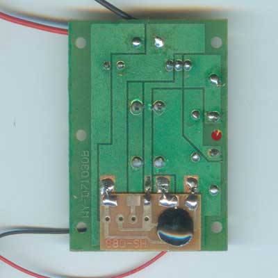 l 用剪下来的元件引脚给音乐IC焊上,IC焊到锡脚的这一面,引脚插到板上焊好。如下图所示: