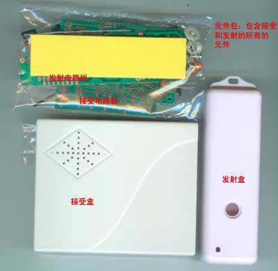 无线遥控门铃套件:适用于大中专学校的学生教学实验,是电子专业的必修课,通信技术、信息技术、机电自动化控制...技能培训(考核)的好教材(材料)。也是中小学生开展第二课堂活动的好教材。 一、产品用途: 1、产品特色:能隔墙遥控,趣味性强。 2、产品用途:门铃或呼叫器。 3、电子小礼品:组装好的产品,赠送老师、同学、家长、亲友……,展示您的学习成果,享受成功和使用的乐趣。