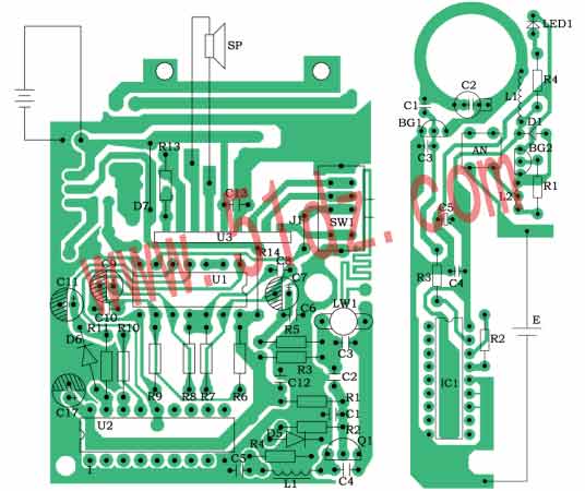 二、工作原理: 1、发射电路:按AN,BG2、L2、R1组成的升压电路把1.5V直流电转换成交流电并升压,D1整流,C5、C4滤波为发射电路提供电源。IC ⒄脚输出一串数字编码信号通过BG1放大后,由L1对外辐射。LED为信号发射指示。 2、接收电路:以Q1为核心的接收电路把电感L1上的无线电信号放大,从集电极输出一脉冲电压,通过C7进入U1放大、整形,U2解码后由⒄脚输入高电平,U1反相由⑥脚输出低电平,触发U3音乐门铃电路,使喇叭发出优美的音乐门铃声。拨动SW1可选择3种不同的音乐声。整机由2节5号电池供电,确保组装安全,本电路采用低功耗设计,确保电池能长时间使用。