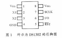 DS1302的结构及工作原理 DS1302 是美国DALLAS公司推出的一种高性能、低功耗、带RAM的实时时钟电路,它可以对年、月、日、周日、时、分、秒进行计时,具有闰年补偿功能,工作电压为2.5V~5.5V。采用三线接口与CPU进行同步通信,并可采用突发方式一次传送多个字节的时钟信号或RAM数据。DS1302内部有一个31×8的用于临时性存放数据的RAM寄存器。DS1302是DS1202的升级产品,与DS1202兼容,但增加了主电源/后背电源双电源引脚,同时提供了对后背电源进行涓细电流充电的能力。 1.1 引脚功能及结构 图1示出DS1302的引脚排列,其中Vcc1为后备电源,VCC2为主电源。在主电源关闭的情况下,也能保持时钟的连续运行。DS1302由Vcc1或Vcc2两者中的较大者供电。当Vcc2大于Vcc1+0.2V时,Vcc2给DS1302供电。当Vcc2小于Vcc1时,DS1302由Vcc1供电。X1和X2是振荡源,外接32.768kHz晶振。RST是复位/片选线,通过把RST输入驱动置高电平来启动所有的数据传送。RST输入有两种功能:首先,RST接通控制逻辑,允许地址/命令序列送入移位寄存器;其次,RST提供终止单字节或多字节数据的传送手段。当RST为高电平时,所有的数据传送被初始化,允许对DS1302进行操作。如果在传送过程中RST置为低电平,则会终止此次数据传送,I/O引脚变为高阻态。上电运行时,在Vcc≥2.5V之前,RST必须保持低电平。只有在SCLK为低电平时,才能将RST置为高电平。I/O为串行数据输入输出端(双向),后面有详细说明。SCLK始终是输入端。