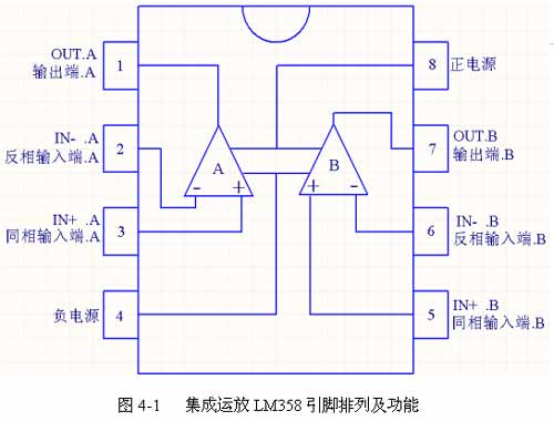 本电路采用的是LM358为8脚集成双运放芯片,其引脚排列级功能如图4-1所示。注意LM358所用直流电源为±12V。