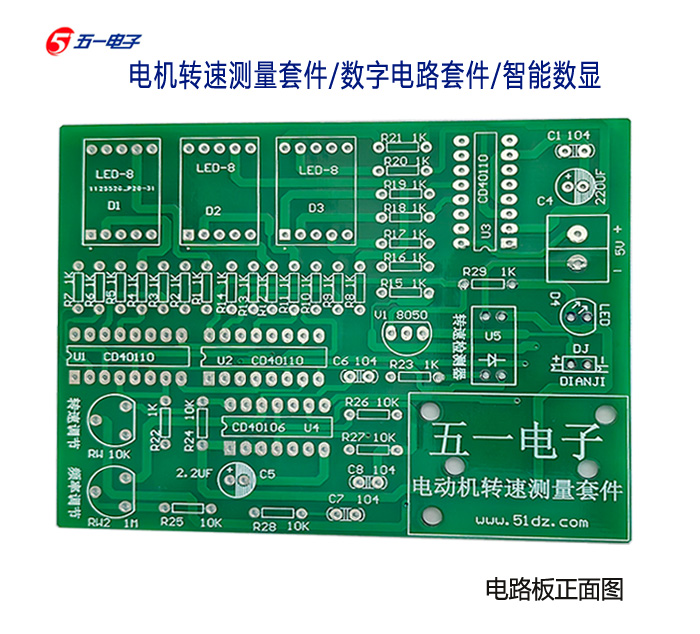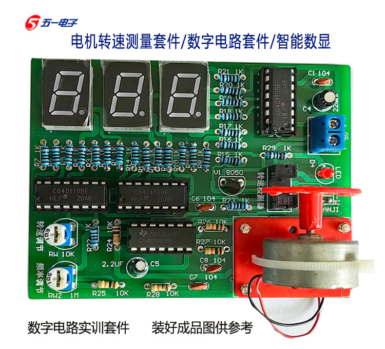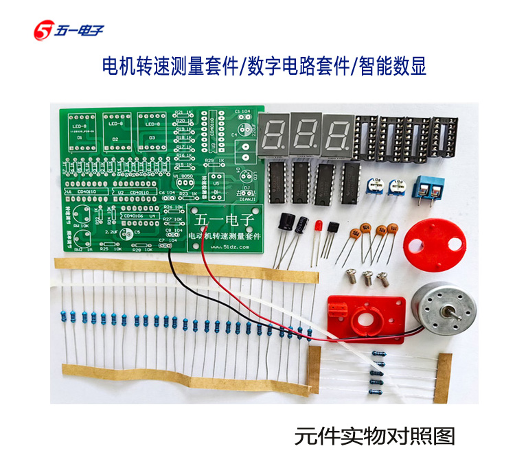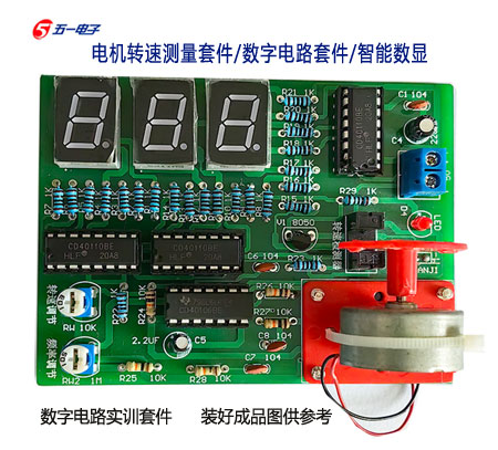 电机转速测量套件:现配有元件清单、原理图、双面玻纤PCB印刷电路板、所有元件和制作说明。本套件一般安装无误都是会一次性成功,全部配有IC插座,如果是IC有问题的话,方便更换使用。本站配的IC都批量试过才发货的,大家放心使用。本套件以数字电路为核心,通过光电开关传感器检测电机转动产生速度电信号,用数字电路进行计数,并采用数码管显示电机速度。