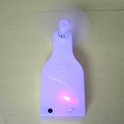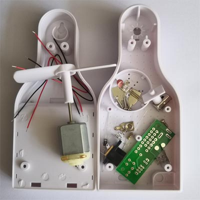 本套件组装好后,就是一个微型小风扇,采用2节5号供电,具有强风、弱风两档调速,同时,七彩变色二极管在风扇肚子里面发光(大家可以自己开孔装到外面来),在晚上时,光线使会将壳体映亮,或者看到点点光亮,令人联相篇篇。