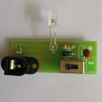 2条8CM导线连接电路板和电池盒正负极,2条12CM将电路板和电动机相连接,让电动机受控制。 |