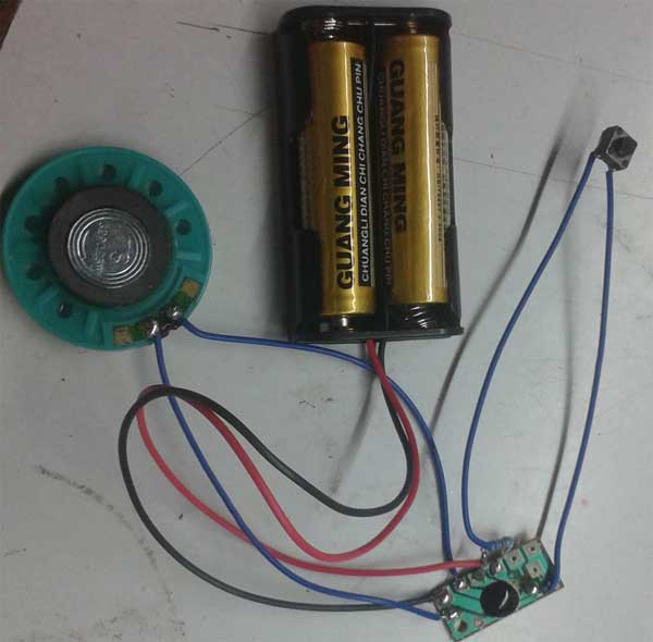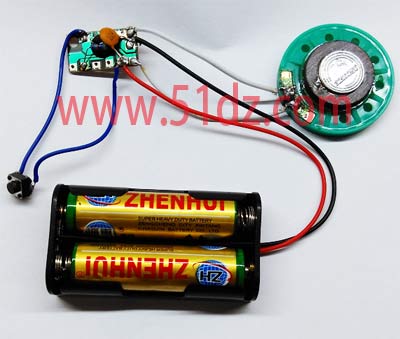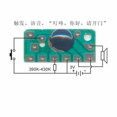 叮咚,你好请开门!触发,规格:长24mm,宽11.2mm欢迎各位电子爱好者邮购、选购。只需花小小钱就可帮你的弟弟妹妹制作一个理想的玩具,同是也可以配合电子实验套件使用,品种很多。芯片里固化了一种语音,叮咚,你好,请开门!触发一下,响一次。本站配套的电阻、喇叭、电池盒、导线都有,找不到也搜索关键字,搜索商品名就会跳出来。如果声音频率有点快的话,可以将电阻加大,这样可以使听到的声音更清楚。