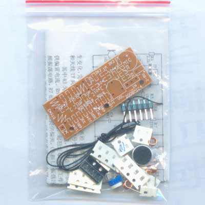 贴片3管无线话筒元件包,装好后就是一个无线话筒,又学习了贴片元件的焊接和练习。FM调频工作方式,音质好,用普通的收音机即可收听。话筒把声音信号变为电信号后,先经一级音频电压放大再送调制级,这样可以拾取更远更微弱的声音。振荡调制后的高频信号再经一级调谐功率放大才送天线发射,发射距离更远及减少手碰天线对振荡级的影响,减少谐波。按照本电路装好后,频率大概在83MHz左右,只需把线圈L的匝距拨开一点,使其振荡频率工作在88MHz—108MHz即可,就可以配合任何FM收音机接收到该高频信号,并从该高频信号还原出声音信号。另外装有外接音频插座及可调电阻调节输入音频信号的衰减量。一、性能参数: 频率范围:80MHz—103MHz (按电路图参数,只调整线圈匝距) 工作电压:1.5V –9V 发射半径:大于100米 4.5V电压,普通收音机接收,无线话筒天线为50cm长的细导线,在高楼房住宅区做的实验)