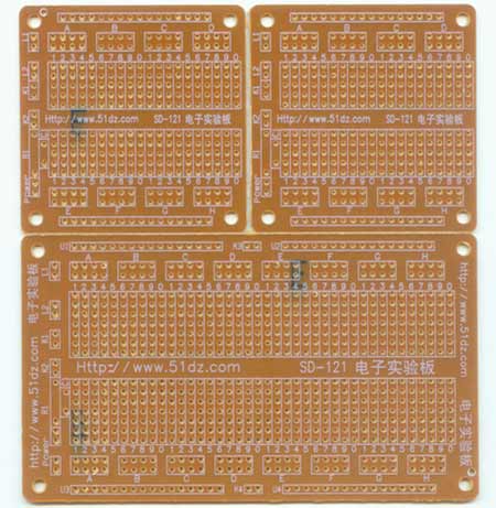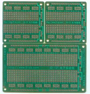 购买本板相当于买三块,一块70mm*121mm,两块60mm*60mm。(注意:本板只有五一电子网站才有销售,万能线路板由于孔位多,需要两套模具分两次冲压。)