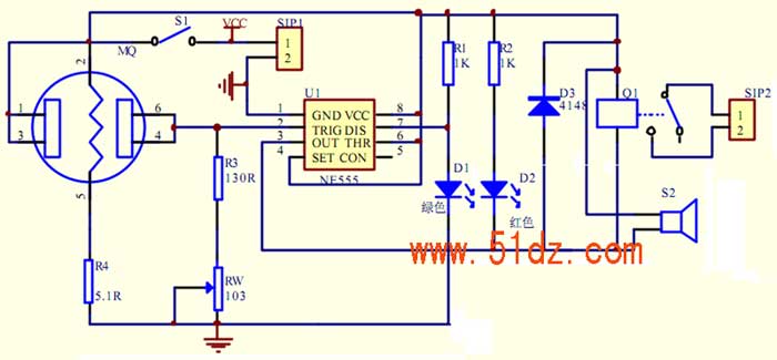 当室内空气正常时,气敏元件QM-2的相应电阻值大,该电阻与R2、W2分压后的电压使555置位,③脚输出高电平,报警电路断开,不发生报警。当气敏元件检测到煤气、石油液化气、汽油、酒精、烟雾等有毒有害气体时,其内阻减小,该电阻与R2、W2分压后的电压升高,从而使555复位,③脚输出低电平,相应又使继电器J吸合,接通报警电源电路,发出报警信号。报警时LED2(红光)闪光。电路中电位器W2用于调整555的触发端②脚的触发电平,正常条件下约为3.5V。本电路中的继电器还可控制机外的报警器或排气扇等设施。