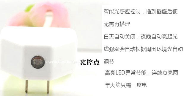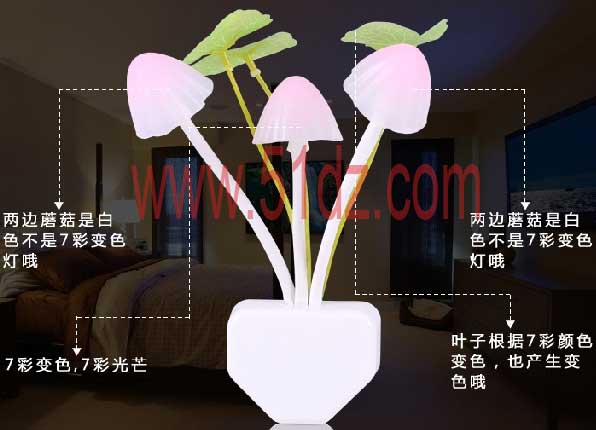 产品特点: 1.节能:小夜灯采用当今最流行的LED技术,超低的用电量,低至1年仅耗1度电。 2.智能:温馨智能的光控开关,根据环境光线的明暗自动开关,光控智能开关。 3.美观:可爱诙谐的蘑菇造型,改变了传统灯具的古板形象增添生活情趣,让您感受大自然风情。 炫彩光控小夜灯为夜间提供一个微弱的照明,当房间光线变暗的时候,炫彩光控小夜灯会自动发出柔和的光线,而当光线变亮的时候,炫彩光控小夜灯会自动关闭,为夜间行动提供一定的方便,同时为您的梦乡停留在美好的那一刻。 温馨提示: 本款小夜灯只有中间的灯是七彩渐变的哦,旁边2个灯是暖光不变色哦。