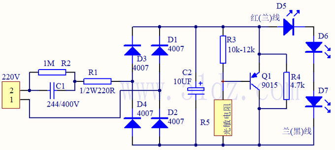 电路工作原理:C1 R1阻容降压,R2为电容放电电阻,经过D1~D4全波整流后,C2滤波;三极管B极电压由R3和光敏电阻分压决定,当环境亮度足够时,R5阻值较小,B极电位较低,三极管不导通,LED熄灭,当环境亮度不足时,R5阻值升高,B极电压随之升高,达到3只LED串联压降+0.7V后,三极管导通,LED得电工作。D5和D7装的是发白光二极管,D6装的是七彩二极管;为他发光二极管焊接牢固本站已经经工厂的机器将发光二极管串联焊接了。大家就用电烙铁焊接也是可以的,不过不够牢固。
