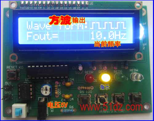 带屏函数信号发生器套件:本套件是利用STC89C52单片机和数模转换器件DAC0832产生所需不同信号的低频信号源,即采用STC89C52 单片机作为控制核心,而在外围采用数字/模拟转换电路(DAC0832)、运放电路(LM358)、按键和LCD液晶显示电路等,通过按键可控制产生方波、锯齿波、三角波、正弦波,同时用LCD液晶显示对应的波形输出。设计过程中主要实现利用按键来控制不同波形的输出,当按键1按下时,函数发生器就切换不同的波形;当按键2按下时,函数发生器就加频率;当按键3按下时,函数发生器就减频率;当按键4按下时,函数发生器就进入调节步进值。