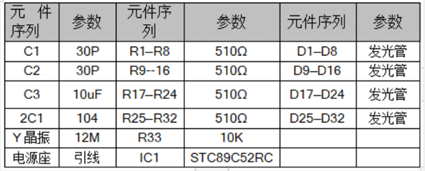 单片机流水灯实际上就是一个单片机最小应用系统,即为由发光二极管、晶振、复位、电源等电路和必要的软件组成的。总共有32个LED灯,4个I/O全部用上了。用510欧电阻串联LED,限流保护LED灯不被烧坏。晶振可以用12M的或11.0592M也行,C1,C2用22PF(或30P)。