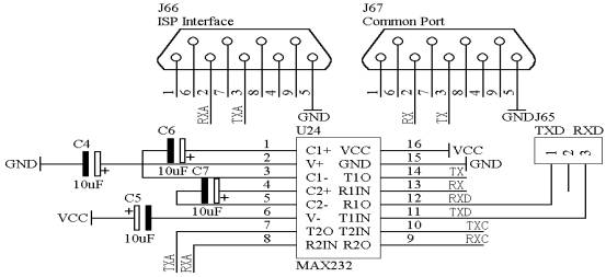 232电平转换采用MAX232芯片把TTL电平转换成RS-232电平格式,可以用于单片机与微机通信,以及单片机与单片机之间的通信,在该系统板上提供了两个DB9的接口,其中一个用ISP下载器模块的程序下载接口,称为“ISP Interface”,另一个接口为单片机与其它具有RS232接口的通信端口,称为“Common Port”。具体的电路原理图如图1.6所示: