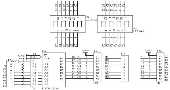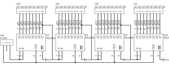 该系统板上采用了四个74LS164(移位寄存器)作为串并转换模块,这四路串并转换模块已经级连起来。串行数据从“RXD TXD”端口输入;具体的电路原理图如图1.15所示: