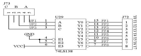 在系统板上提供了三八译码模块,控制译码器译码信号由“C B A”端口输入,译出的控制信号由“Y0-Y7”输出。电路原理图如图1.14