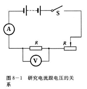 实验按图8-1连接电路,其中R是定位电阻,R`是滑动变阻器.闭合开关S后,调节滑动变阻器的滑片,使R两端的电压成整数倍地变化,如2伏、4伏、6伏等.根据电压表和电流表的示数,读出每次加在R上的电压值和通过R的电流值.